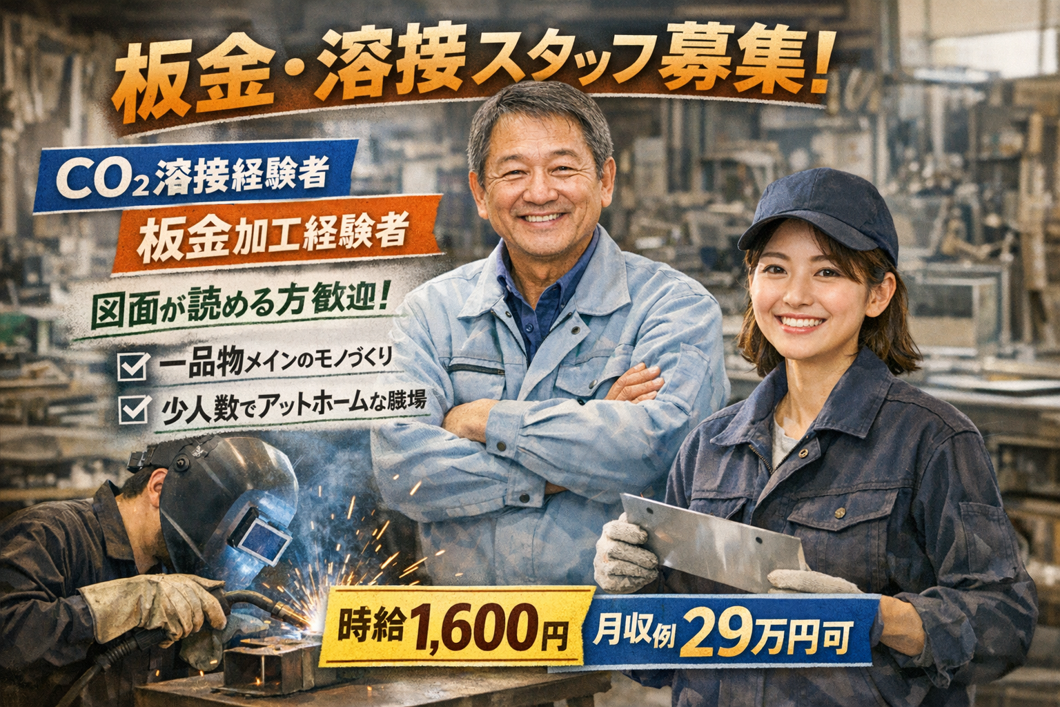 | 仕事内容 | 工場内約25名のアットホームな金属加工会社です。 ■ 金属製品の板金加工 ■ CO2溶接(半自動溶接がメイン) 量産というよりは一品物・試作系が多い現場になります。 流れ作業ではなく、図面を見ながらしっかり作り込む仕事です。 【募集職種】 1.CO2溶接スタッフ 2.板金加工スタッフ ※どちらも経験者募集 ※図面を読める方 溶接はCO2がメインですが、 アーク・TIGなど他溶接経験でもOKです。 「今より落ち着いた環境で働きたい」 「量産より技術を活かしたい」 そんな方に合っています。 【月収例】 1,600円 × 8h × 21日 = 268,800円 +残業10時間(約20,000円) →月収約29万円可能 【ここがポイント】 ◆少人数で風通しが良い ◆技術をしっかり評価してもらえる ◆一品物中心でやりがいあり ◆残業少なめ ◆男女OK まずは職場の雰囲気見てから決められます! |