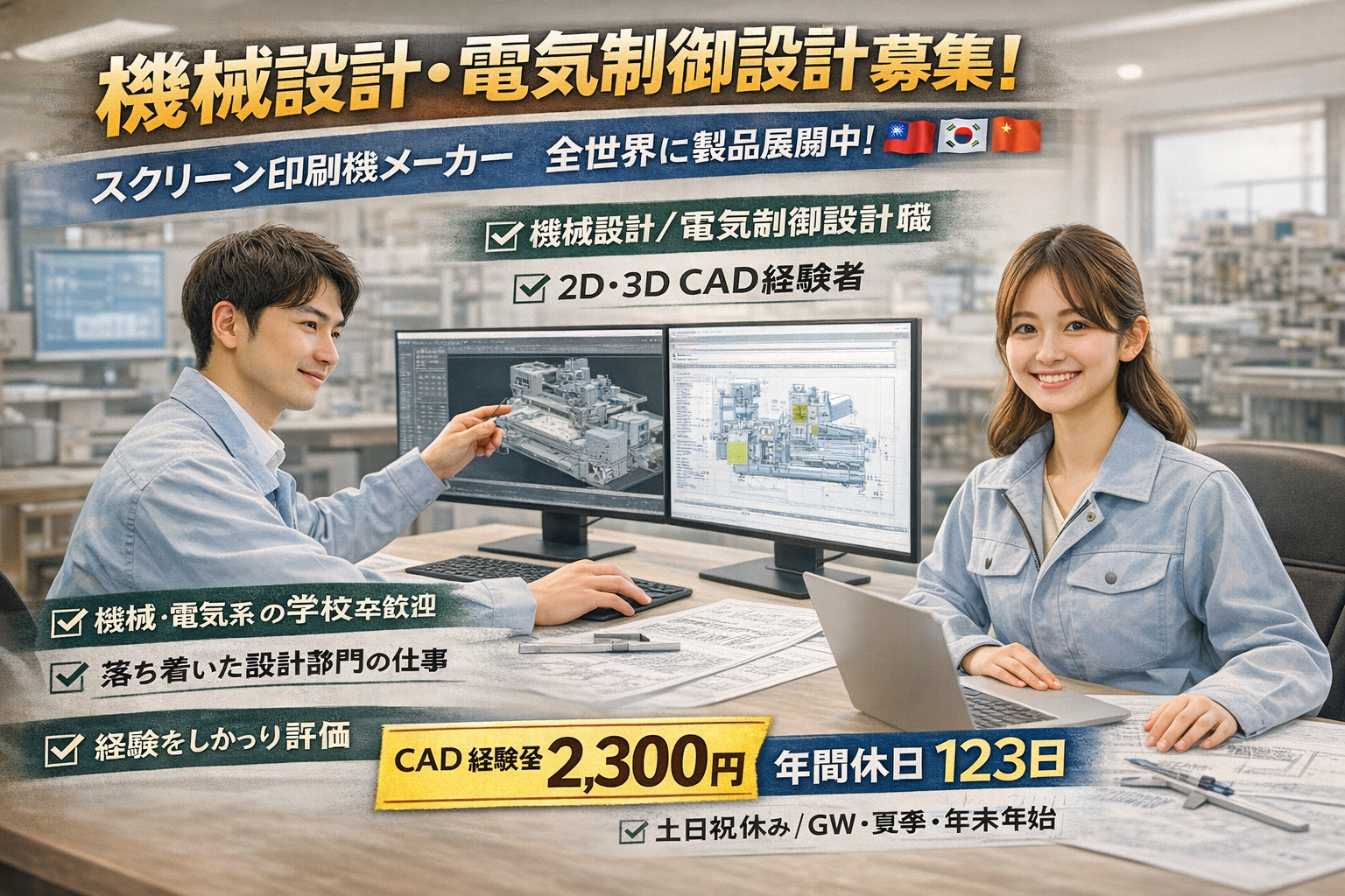 | 仕事内容 | 【仕事内容】 電子部品やディスプレイなどの製造工程で使用される スクリーン印刷機の設計業務を担当していただきます。 ■機械設計職 ・お客様との打合せ ・装置仕様の決定 ・部品選定 ・2D/3D CADを使用した部品設計 ■電気制御設計職 ・制御設計 ・回路設計 ・PLC設計 など 国内(日本全国)および 台湾・韓国・中国・アメリカなど 世界各国へ装置を出荷しています。 《月収例》 2,300円×8時間×21日=386,400円 +残業代別途支給 【この仕事の魅力】 ☆世界に出荷される装置の設計に携われる ☆仕様決定から関われるやりがいあるポジション ☆土日祝休み&年間休日123日 ☆高収入で安定勤務 少しでもご興味をお持ちいただけましたら、ぜひご応募ください。 まずはお話だけでも大歓迎です。 |