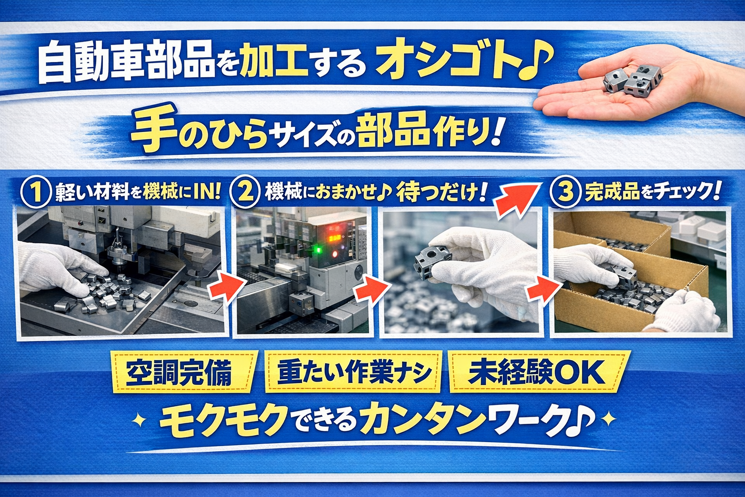 | 仕事内容 | 自動車部品を加工するオシゴト♪ お願いするのは、 エンジン周辺などに使われる 手のひらサイズの部品作り! 重たい物は一切なし◎ 空調完備の工場内で、 季節を気にせず快適に働けます♪ 具体的には・・・ 1.軽い材料(金物)を機械にセット★ 2.機械が自動で加工!終わるまで待つだけ◎ 3.完成品を取り出して、 キズがないか目で見てチェック♪ 4.最後に箱へ詰めて完了! 作業はとってもシンプルなので、 工場ワークが初めての方も安心! 慣れたら自分のペースで モクモク進められるお仕事です。 正社員登用も目指せます(^_-)-☆ |