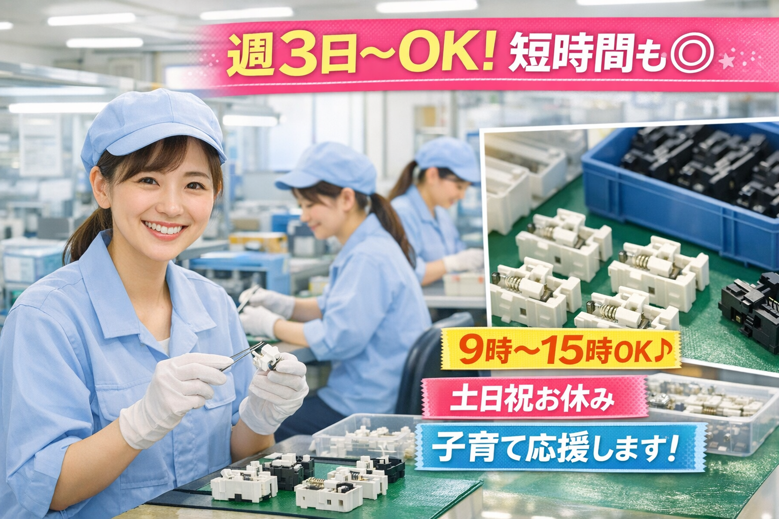 | 仕事内容 | \ピンセットで“パチッ”とはめるだけ♪/ 手のひらサイズのブレーカー部品を組み立てる、超シンプル作業です。 具体的には… (1)小さな箱に“ばね”をピンセットでセット (2)プラスチック部品をカチッとはめるだけ ★重たい物なし ★ライン作業なし ★基本1人作業でモクモク集中♪ ★ここが主婦さんに選ばれる理由★ ・9:00~15:00など短時間OK! ・週3~4日勤務OK(扶養内も相談OK) ・土日祝休み+平日の休みも自由に相談OK! ・お子さんの急な発熱・学校行事も柔軟対応◎ ・未経験スタート9割!丁寧に教えてもらえる♪ ・年中25℃の空調完備で快適! |
